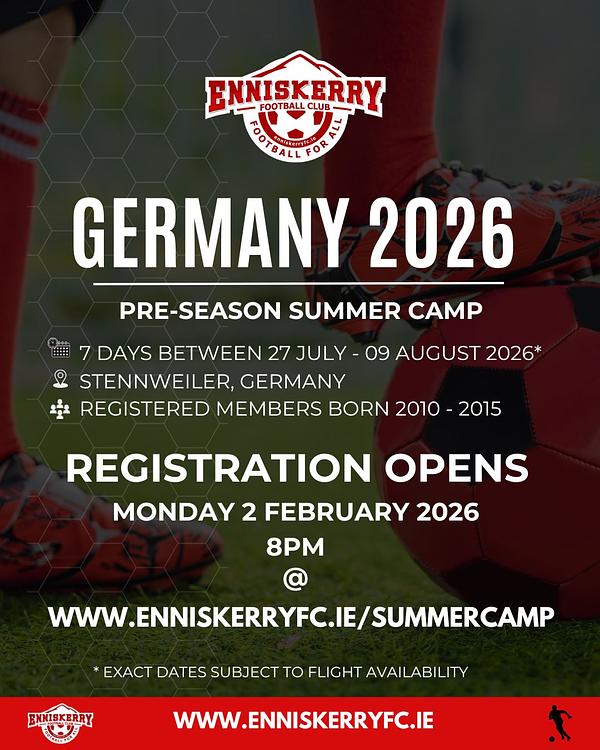 Thank you to everyone who has registered their interest in the Annual Football Trip to Stennweiler. Registration for the Stenweiler Football Camp will be open after 8pm on Monday 2nd February on the Enniskerry ClubZap site: